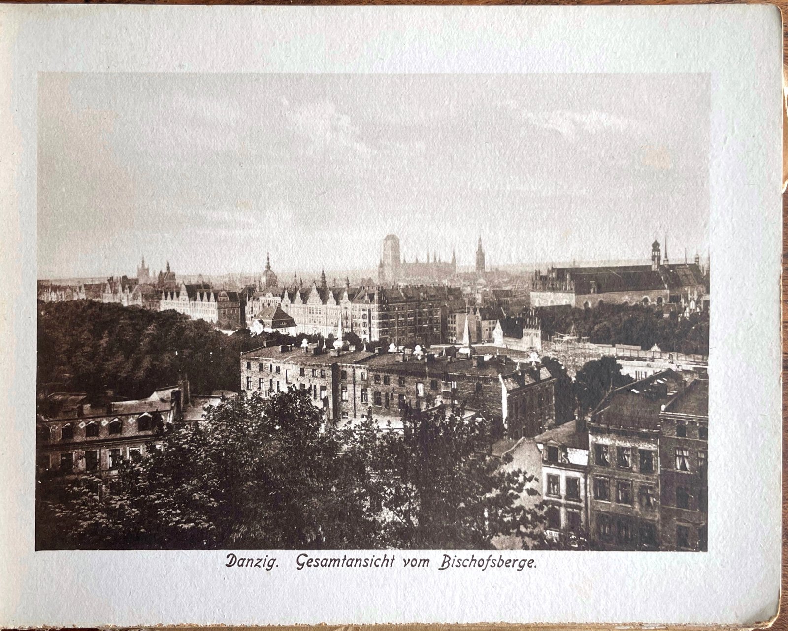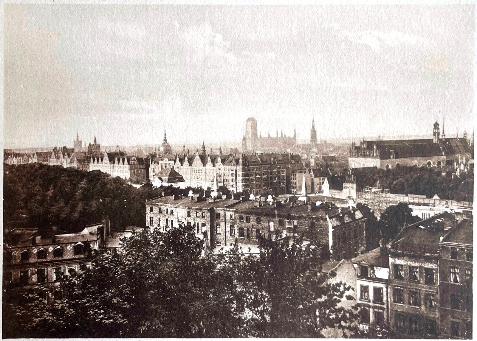 Od lewej nad miastem widać: wieże Świętej Katarzyny i Więzienną, kopułę Wielkiej Synagogi, masyw Kościoła Mariackiego, wieżę Ratusza Głównomiejskiego, bryłę kościoła i klasztoru Świętej Trójcy.