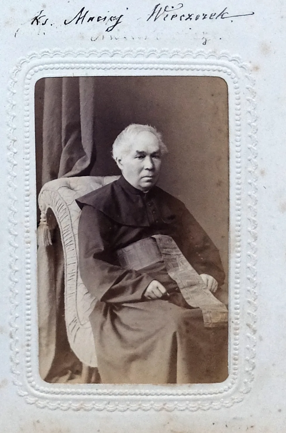 Jeśli podpis się zgadza, jest to ks. Maciej Wieczorek, proboszcz w podkrakowskich Wróblowicach, inicjator budowy tamtejszego kościoła (lata 70. XIX w.).
