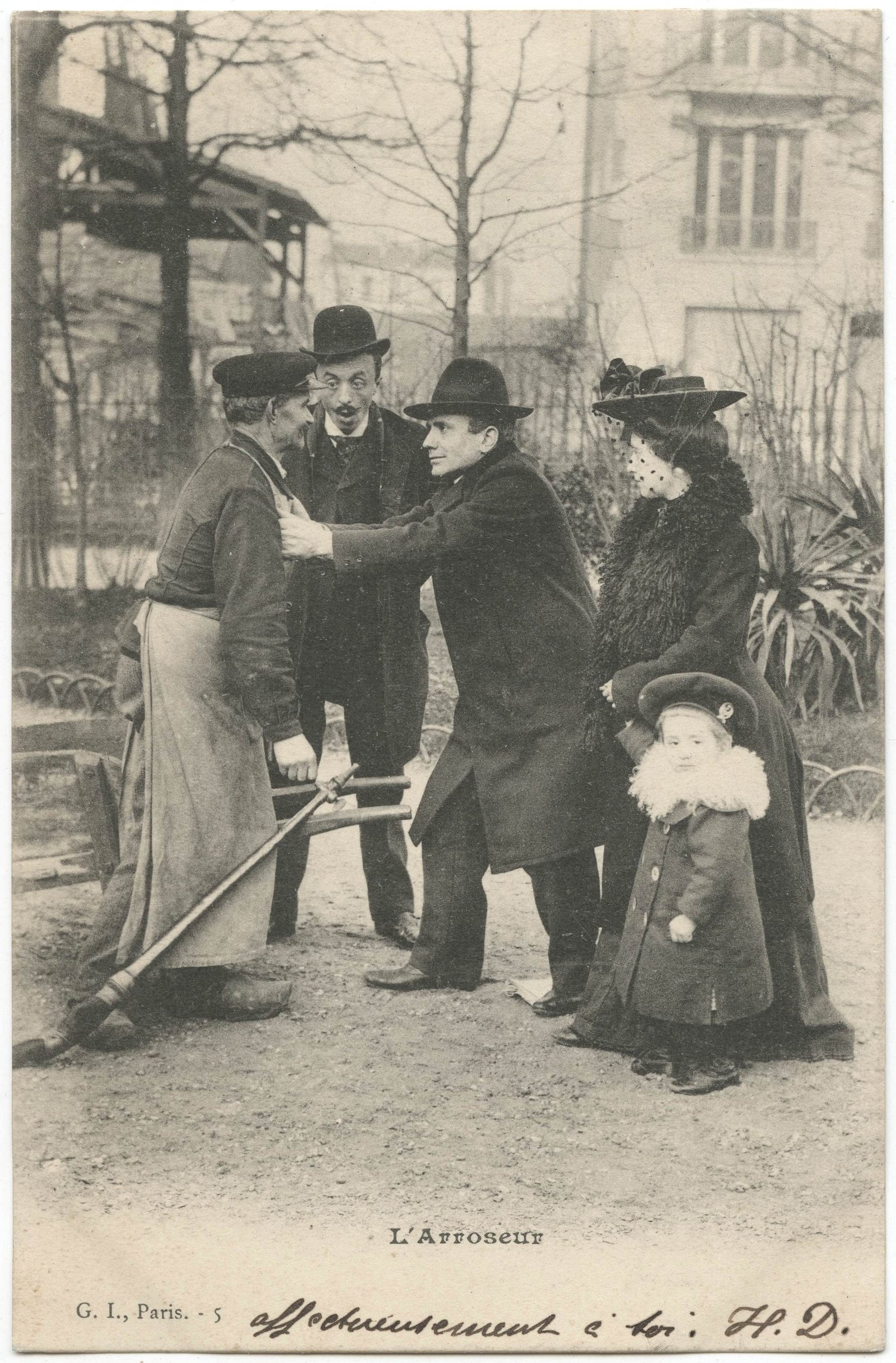 „Polewacz polany” to oczywiście tytuł króciutkiego filmu – jedynego filmu fabularnego braci Lumiere, zrealizowanego w 1895 roku. Ta seria autorstwa paryskiego wydawcy G. I. rozwija tamten koncept.