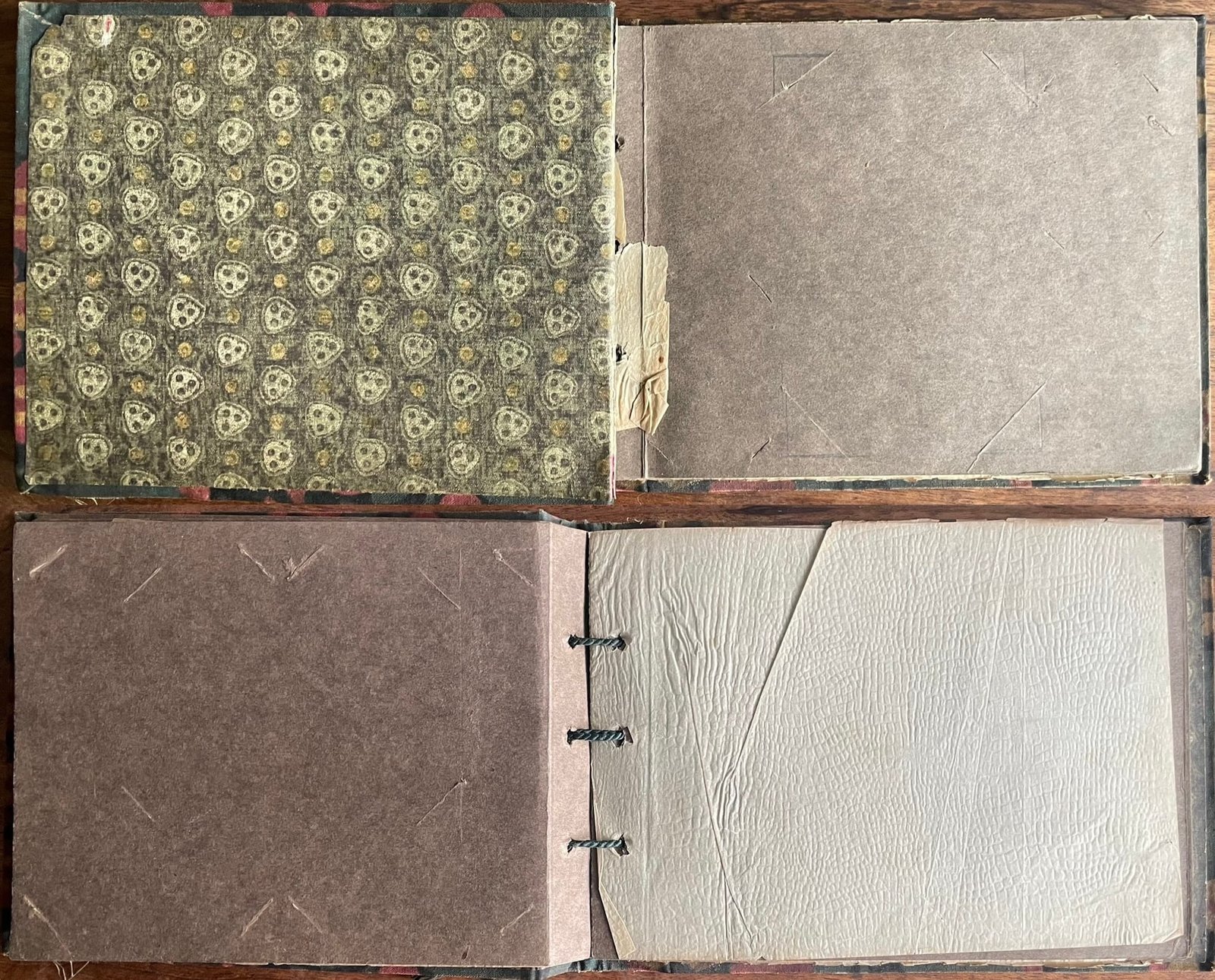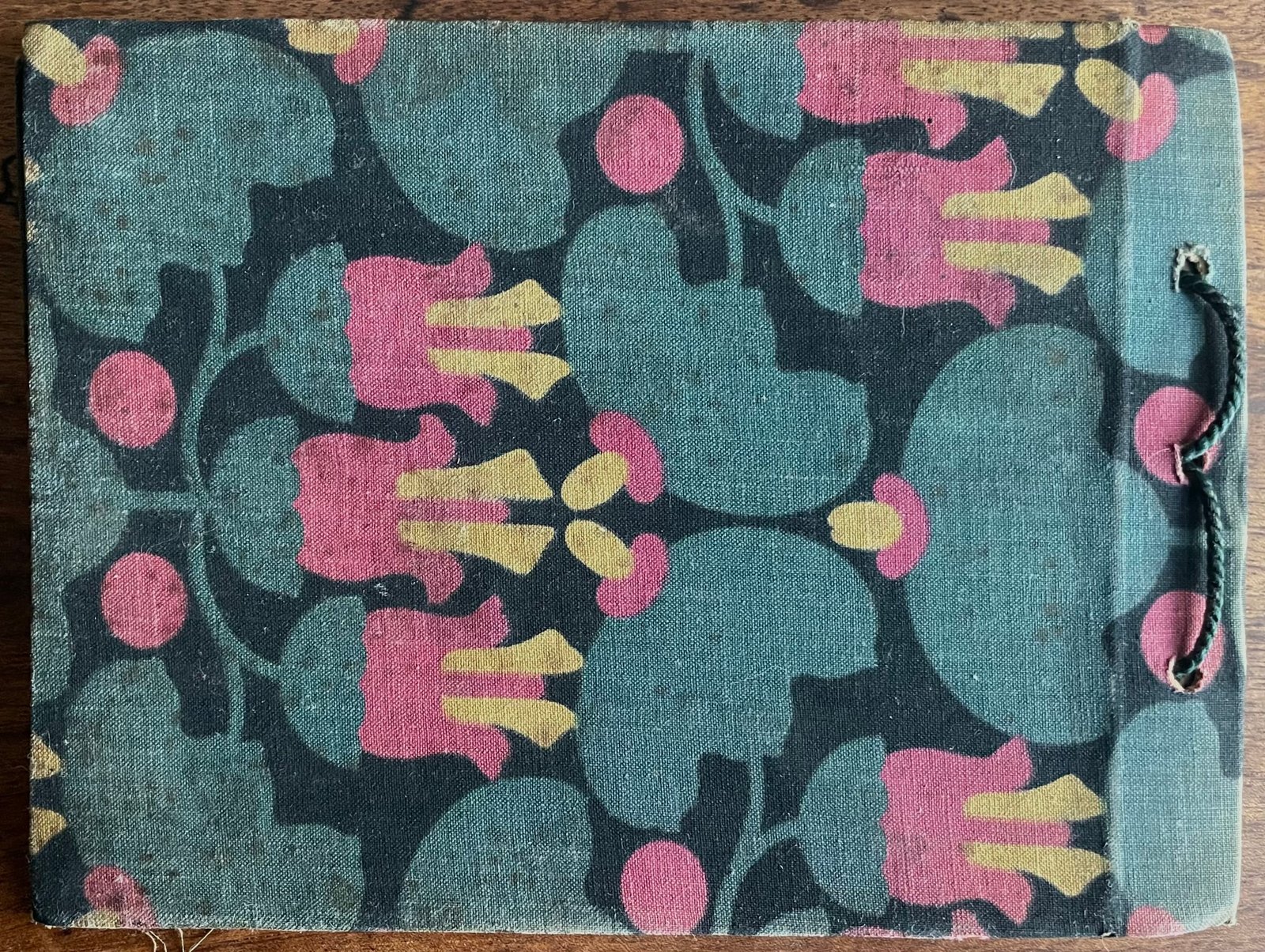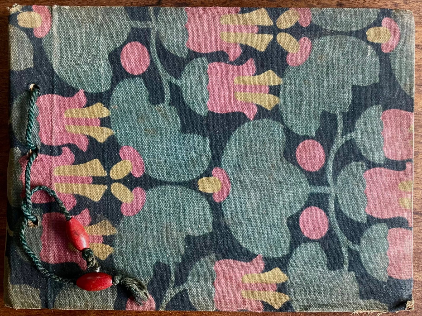 Album 22,5×17 cm z kartonu obciagniętego tkaniną (malowaną? drukowaną? batikową?), związany zielonym sznureczkiem z czerwonymi drewnianymi koralikami. Wyklejka z ornamentem geometrycznym.