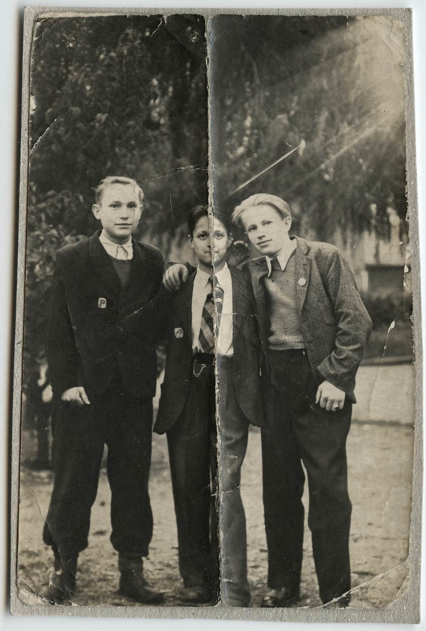 Na ubraniach chłopców po lewej i w środku naszywka „P”, oznaczająca robotników przymusowych.